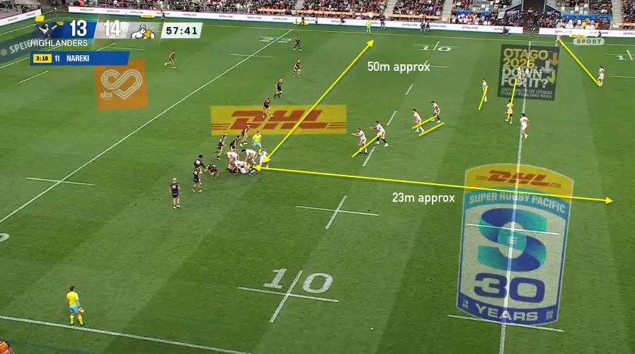 That leads to static carries and difficult passes under pressure. It’s why we love the tip-ons in that front pod. Even with the gainline win after the tip pass from Wycherley, the outcome is still the same — a flat bridge pass over the top to a static runner on the edge, who has to cut back inside.