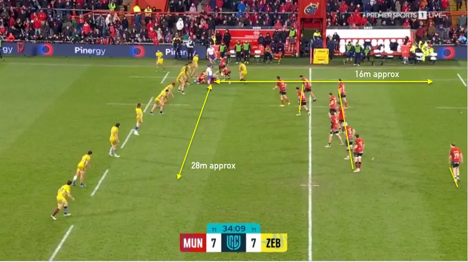 In a general sense, for the last few seasons Munster have mostly played in front of defences to punish any compression or corner with multiple runners. This is the “flat” attack I have spoken about. It’s not always flat, but it is mostly so and relies on tight handling in multiple looping runners — with split midfielders — to activate the space.