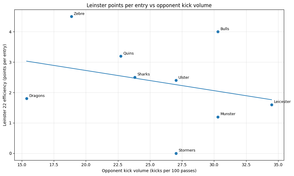 - Across these 9 matches, opponents average ~25.5 kicks per 100 passes versus Leinster ~14.0.