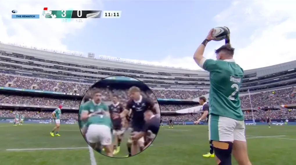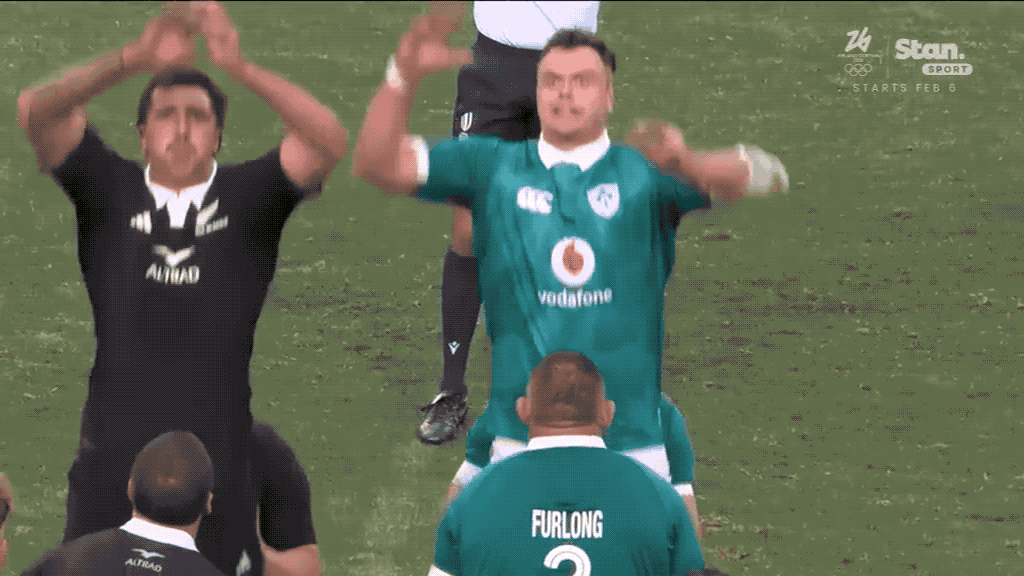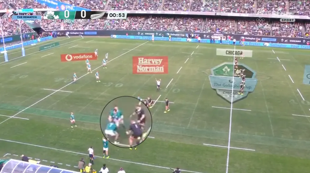 This is a five-man “thread pull” where Baird walks up as the middle jumper, before darting to the front with Ryan weaving behind as a lifter. Looking at the reaction of Ryan, Beirne and Furlong, this was going to be a simple pace jump at the front to win easy possession, drop it back to Gibson Park, who will likely hit Crowley for a kick reset up the field. Either that or a set maul to bind the All Blacks into a maul set, before doing the same kicking plan.