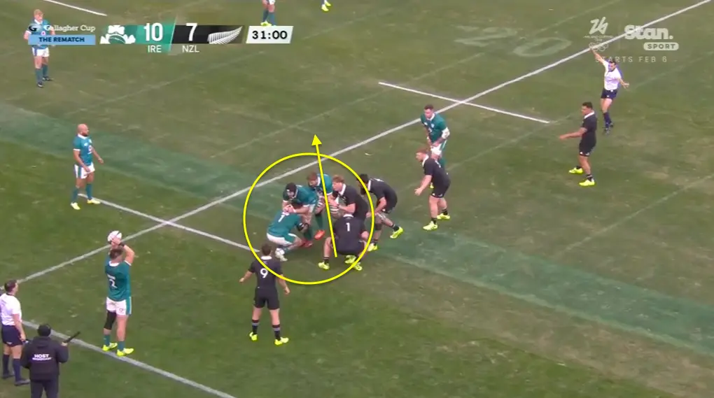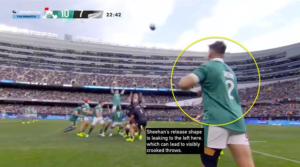 The All Blacks weren’t going to compete on this one — Jason Ryan, the All Blacks forward coach, puts a huge focus point on maul defence in this zone — so it should be a clean take, but it’s not a good throw by Sheehan. Baird has to adjust mid-air and does well to bat it back, and we score from this one.