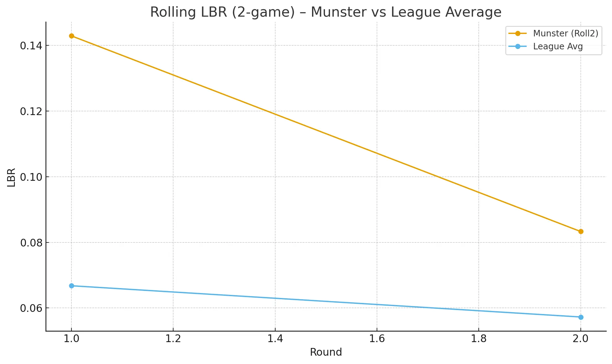 Munster’s LBR ranking went down alongside the average, but a little more than expected, due to the side we were playing alongside the greasier conditions on the night.